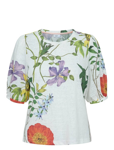 Blomstermotiver tilføjer et strejf af natur til denne kortærmede bluse. Det lette materiale og den afslappede pasform gør den ideel til varmt vejr, mens de subtile pufærmer tilføjer et strejf af elegance.
