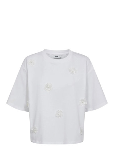 Delikate blomsterapplikationer tilføjer et strejf af finurlighed til denne kortærmede T-shirt. Den afslappede pasform gør den til et nemt valg til hverdagsbrug, der tilbyder både komfort og en subtil, legende æstetik.