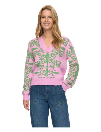 Løft din hverdagsstil med denne iøjnefaldende pullover med V-hals. Med lange ærmer og et karakteristisk mønster tilføjer dette strikkede stykke tøj et strejf af elegance til ethvert outfit.