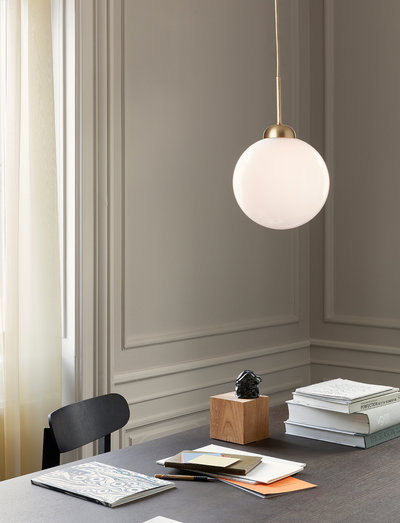Den rene kontrast mellem den slanke metaltråd og den store opalhvide glaskugle gør Apiales 1 Large til et klassisk, men alligevel moderne valg af belysning i hjemmet.