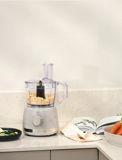 På hver tilbehørsdel står der, hvilken hastighedsindstilling du skal bruge, så du allerede fra første forsøg ved, at du får det rette resultat, og i stedet kan fokusere på resten af din madlavning. Når du er færdig med at lave mad, vasker du ganske enkelt tilbehøret i opvaskemaskinen. Takket være det kompakte design kan du nemt opbevare foodprocessoren i en skuffe eller et skab; tilbehøret placerer du i beholderen, så du hurtigt og nemt kan begynde at bruge din foodprocessor, når du har brug for det.