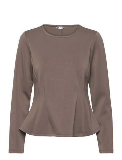 Denne langærmede top har en diskret peplumkant, der giver en flatterende silhuet. Den runde halsudskæring og det figursyede design gør den til en alsidig tilføjelse til enhver garderobe.