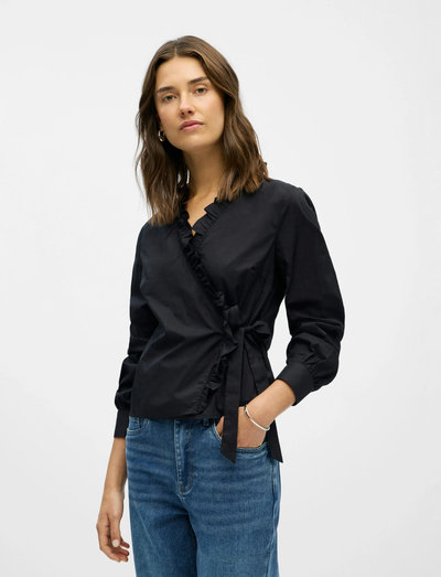 Denne langærmede skjorte har et flatterende slå-om-design, der giver et elegant touch. Den fine flæsekant langs halsudskæringen tilføjer en raffineret detalje, mens bindelukningen sikrer en behagelig og justerbar pasform.