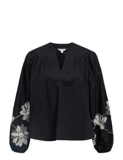 Denne bluse tilbyder alsidige stylingmuligheder og er en garderobeklassiker. Det vævede stof giver struktur, mens V-udskæringen og raglanærmerne tilføjer et elegant touch. Afsluttes med elastiske manchetter og fine broderier, perfekt til fester eller hverdagsbrug.