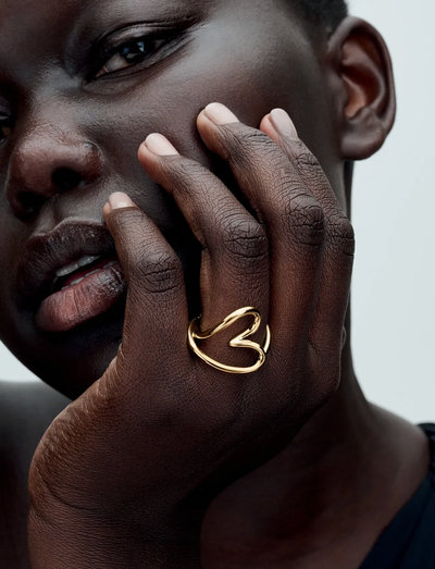 Bring kærlighed og natur sammen med den organisk formede hjertering. Et diskret bølget 14 kt. guldbelagt bånd deler sig i et uperfekt formet hjerte med et åbent mønster, der følger fingeren vandret på forsiden. Når den bæres, er det kun den midterste del af hjertet, der rører ved fingeren, mens resten af ringen er løftet. Denne skulpturelle hjertering er designet i en let opskaleret størrelse og er et slankt og moderne statement, der passer smukt sammen med andre varme, minimalistiske smykker.