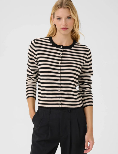Denne cardigan er defineret af knaplukningen foran, hvilket gør den til et alsidigt lag-på-lag stykke. Det fine strik giver en let følelse, ideel til overgangen mellem årstider.