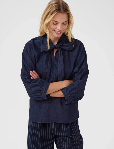 Denne skjorte er fremstillet i denim og har et karakteristisk design med bindebånd i halsen, hvilket tilføjer et sofistikeret touch til et klassisk materiale. De trekvartlange ærmer og den afslappede pasform gør den til et behageligt, men stilfuldt valg til forskellige lejligheder.