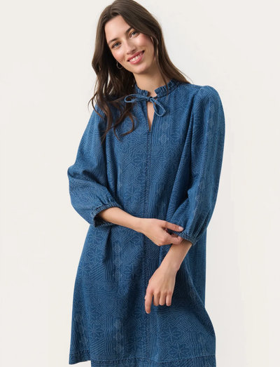 Denne kjole er fremstillet i denim og har en fin bindelukning i halsen og diskrete pufærmer. Knælængden gør den anvendelig til mange lejligheder.