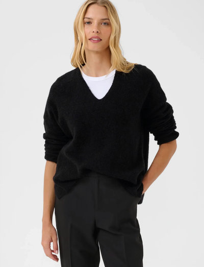 Denne pullover er fremstillet med en blød, børstet tekstur, hvilket giver en behagelig og stilfuld mulighed for lagdeling. V-halsdesignet og den afslappede pasform gør den let at bære til forskellige lejligheder. Det enkle, men elegante design sikrer, at den passer godt sammen med både afslappede og mere formelle outfits.