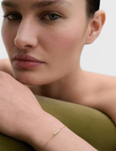 Et delikat kædearmbånd med fem funklende hvide zirkoner. Dette smykke giver et subtilt strejf af elegance, perfekt til hverdagsbrug eller særlige lejligheder.