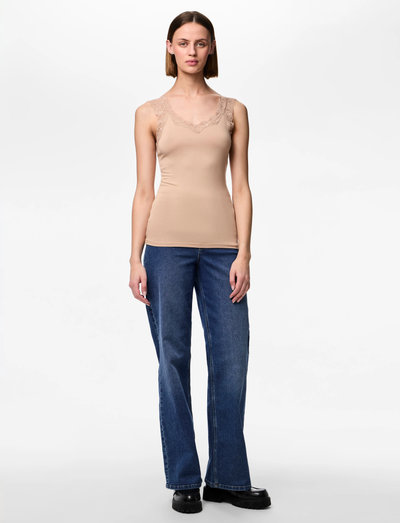 Delikate blondekanter løfter denne ærmeløse tanktop. Den tætsiddende model er fremstillet af blød viskose, et glat materiale, der falder som silke. En ideel basis for komfortable og trendy hverdagsoutfits.
