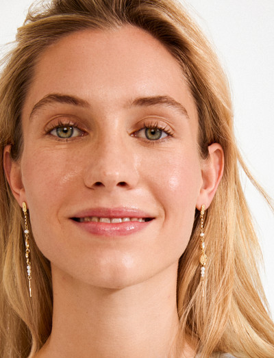 Disse guldbelagte øreringe er det perfekte boho-tilbehør, når du vil udstråle drømmende vibes og luksuriøse detaljer. En slank silhuet kombinerer ferskvandsperler, funklende krystaller og rustikke vedhæng. De kunstnerisk inspirerede teksturer svajer ubesværet og tilføjer karakter til både sommerkjoler og skarpt skræddersyet tøj. Disse øreringe udstråler en fri ånd og er klar til festivalsæsonen eller middage på tagterrassen. Fremstillet af 81 % genbrugsmaterialer.