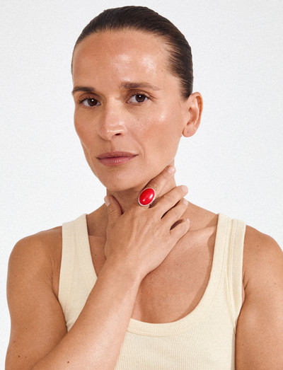 Skab et levende udtryk med denne sølvbelagte ring, der har en markant, oval sten. Den intense, skarlagenrøde farve udstråler passion og power, perfekt til at tilføje et farvepift til ethvert outfit. Den justerbare størrelse sikrer en behagelig pasform, uanset om den bæres alene eller sammen med andre smykker. Fremstillet af vandafvisende materialer og 75% genanvendt indhold, er det et stilfuldt og bevidst valg.