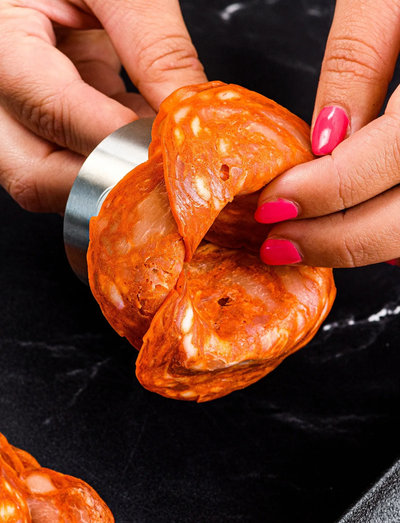 Runde pyntringe er perfekte til at stikke kagen ud eller lave ingredienserne runde på tallerkenen. Ved hjælp af nedstopperen skubber man også nemt fyldet tilbage ud af formen. Fyld en pyntring med for eksempel bøf tartar, risotto eller en tykkere puré og tryk med nedstopperen og løft derefter forsigtigt ringen. TIP: Hæld en lille dråbe sauce på tallerkenen og præg den med nedstopperen, så den skaber en flot kontur til en ekstra smukt dekoreret tallerken.