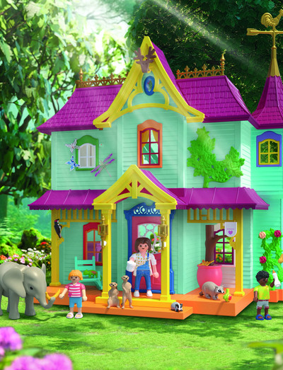The vibrant, cheerful villa is the heart of life for the animal-loving woman, her two children and their loving animal companions. Here, everyone has lots of fun and can always count on each other. The little elephant eagerly helps set the table, while the baby giraffe cheekily sneaks treats around the house. The raccoons frolic in the attic, the cheetah cub love to swing, and the little monkey enjoys climbing and relaxing in the tree that has grown from the porch into the house. Looking for the little duck? She’s happily splashing around in the indoor pond, while the meerkats have found their favorite spot in a secret hideout at the front, beneath the grand staircase. However, the most sought-after spot in the entire house is the cozy cave with a bed at the back, under the stairs.