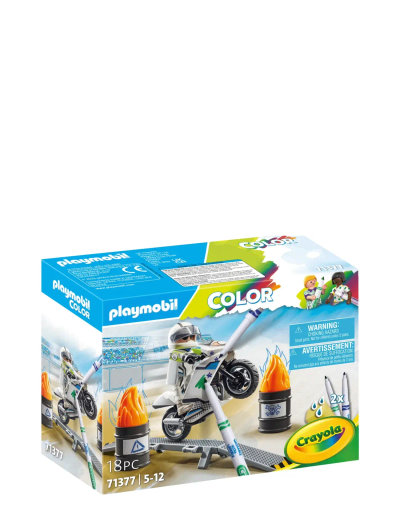 Sæt kulør på legen med PLAYMOBIL Color! Design din stuntmotorcykel helt efter dit eget hoved med de medfølgende farver. Den hvide grundfigur giver maksimalt spillerum til kreative ideer. Farven er nem at vaske af igen - for timevis af legesjov.