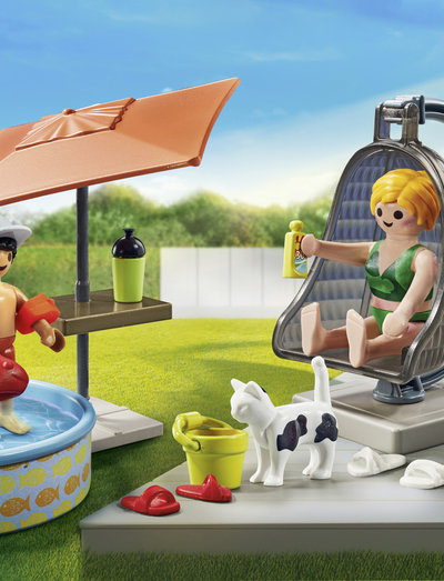 Sommer, sol og vandsjov! Mor og søn nyder det gode vejr. Moderen slapper af i hængestolen og ser den lille dreng plaske rundt. Den lille nysgerrige kat observerer ham nøje. Uanset om det er før solbadning eller efter at have plasket rundt, er det vigtigt at smøre sig ind i solcreme regelmæssigt! Heldigvis er solcremen allerede forberedt. Effekt af solskoldning: Kvindefiguren bliver rød under UV-eksponering.