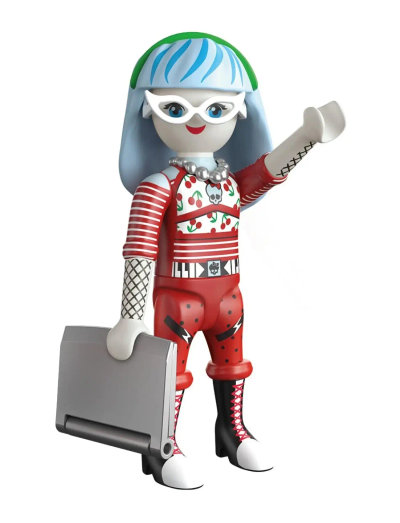 Brains, beauty, and Playmobil charm! Ghoulia Yelps arrives with her iconic glasses, signature blue streaks, and a ghoul-tech laptop that’s always on standby. Perfectly articulated for posing and storytelling, she’s a must-have for collectors who love a smart addition to their shelf.