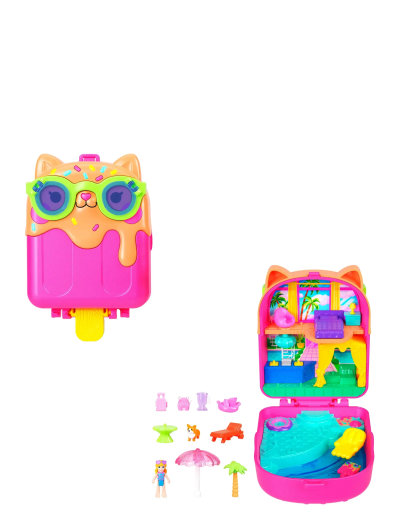 Denne nuttede Polly Pocket Kitty Popsicle Resort-æske har form som en killingeispind, der har sjove solbriller med glas, der kan vippes op! Åbn æsken og oplev et tropisk hotelophold! Tjek ind til sjov med en mikrodukke og 11 stk. tilbehør, herunder en hundehvalp! Slap af under en parasol eller på den flydende liggestol! Snup en smoothie fra snackbaren med et kasseapparat, der bevæger blenderen op og ned der er så mange muligheder! Når det er tid til afgang, kan du bare pakke æsken sammen til sjov på farten. Den ideelle gave til børn fra fire år og opefter, især dem, der elsker kæledyr og hoteller. Fås så længe lager haves. Farver og mønstre kan variere.