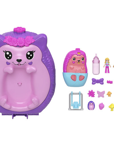 Den nuttede Polly Pocket-legesæt med pindsvinemor og baby er fyldt med 2-i-1-sjov med kæledyrstema. Giv babypindsvinet mad, og se det gøre sin ble våd, før de begge åbnes for at afsløre bittesmå verdener fyldt med store eventyr. Der er så meget at gøre med 2 mikrodukker og 16 tilbehørsdele, bl.a. kæledyr. Sæt en dukke fast på vingefunktionen, og skub den frem og tilbage for at flyve. Derefter kan du hænge ud i paddehattehuset med pindsvinevenner eller tage en tur på vippen. Æskerne med pindsvinemor og baby samles med en bro, så dukker og kæledyr kan gå fra børneværelset til haven og tilbage igen. Ideel til leg på farten, fra 4 år og opefter. Sælges hver for sig og så længe lager haves. Farver og mønstre kan variere.
