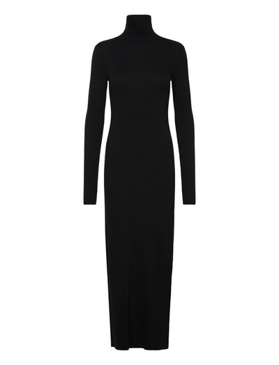 Denne kjole er fremstillet i et strækbart ribstrikket materiale, der smyger sig elegant om kroppen. Designet har en rullekrave og lange ærmer. Den er skåret til at falde lige over anklen og er en ubesværet model, der trækkes på.