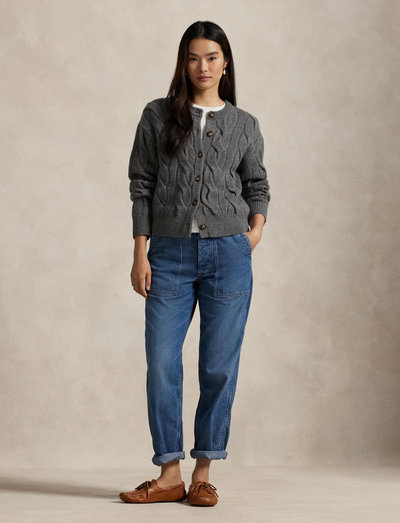 Denne cardigan er fremstillet af en blød uld-cashmere blanding og har et klassisk kabelstrikket design. Den afslappede pasform og rund hals gør den til et behageligt og stilfuldt lag. Den er afsluttet med en knaplukning med specialudviklede knapper.