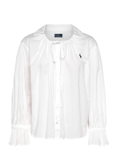 Denne top er fremstillet i sprød bomuldspoplin og har et bindebåndsdesign i halsen, der tilføjer et sofistikeret touch. De lange ærmer er afsluttet med fine flæser ved manchetterne, hvilket fremhæver det feminine udtryk. En alsidig beklædningsgenstand til enhver garderobe, der giver et raffineret look med sine rene linjer og behagelige pasform.