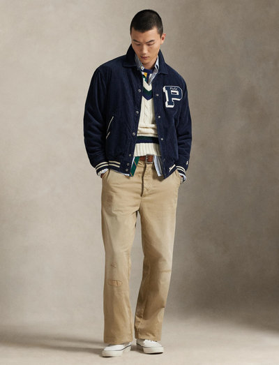 Denne jakke er fremstillet i bredriflet fløjl og har et universitetsinspireret kunstværk fra arkivet. Den har en lige krave og en trykknaplukning med specialudviklede metalknapper. De lange ærmer har stribede ribkanter, og venstre side af brystet er prydet med et chenille "P"-mærke med "Polo"-broderi. Den har også to vinklede forlommer i taljen, en indvendig venstre lomme i taljen, kædestingbroderi under højre lomme og midt på ryggen. Den stribede ribkant og det fulde for giver ekstra komfort og stil.