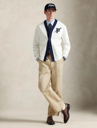 Et gotisk “P”-mærke med en åre tilføjer et karakteristisk præg til denne lette cardigan. Den er fremstillet af en blød bomuldsblanding og har en V-hals og en stolpelukning med fem knapper i corozo. Designet er afsluttet med lange ærmer og ribstrikkede manchetter.