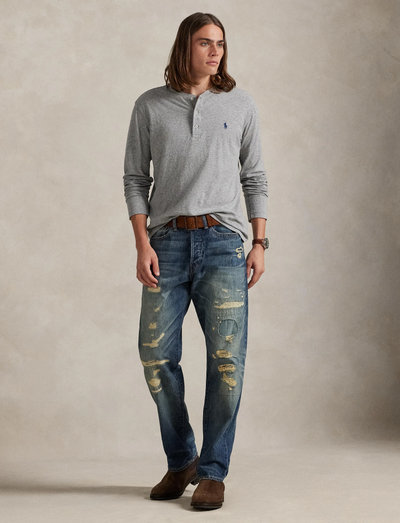 Originally worn by English rowers in crew races, the classic Henley shirt is reimagined through a modern Polo lens with slub cotton jersey.Size medium has a 28" body length (front and back), an 18" shoulder, a 42" chest, and a 34.5" sleeve length. Sleeve length is taken from the center back of the neck and changes 1" between sizes.Henley neckline. Three-button placket.Long sleeves.