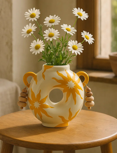 De strålende gule blomster og de smukt afrundede former er en hyldest til solens livgivende lys. De dekorative håndtag prydet med træperler tilføjer et organisk og naturligt touch, der gør vasen endnu mere iøjnefaldende.