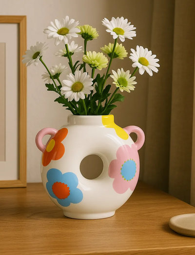 De strålende gule blomster og de smukt afrundede former er en hyldest til solens livgivende lys. De dekorative håndtag prydet med træperler tilføjer et organisk og naturligt touch, der gør vasen endnu mere iøjnefaldende.