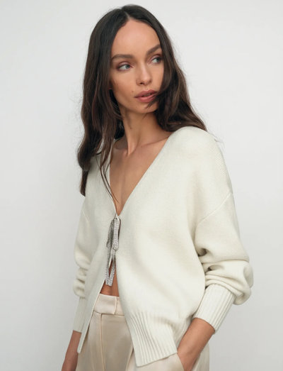 Denne strik er afsluttet med en fin sløjfe og tilføjer et strejf af elegance. De lange ærmer og V-udskæringen bidrager til den raffinerede silhuet, hvilket gør den til et alsidigt lag-på-lag stykke.