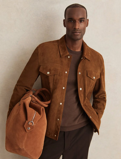 Denne jakke er fremstillet i blødt ruskind og har et klassisk trucker-design med et moderne twist. Den er detaljeret med spidse klaplommer på brystet, trykknapper og trekantede syninger, der fremhæver fronten.