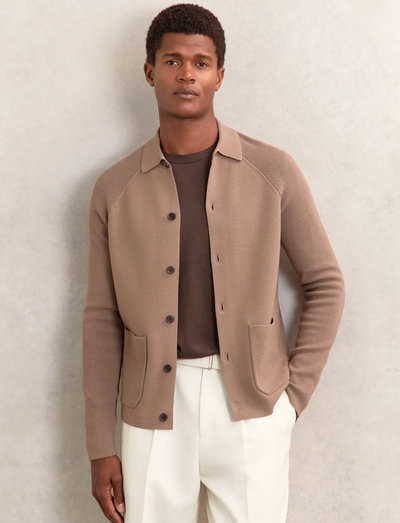 Denne strikkede skjorte har en knaplukning foran og en klassisk krave, hvilket giver en elegant silhuet. De ribstrikkede raglanærmer og påsyede lommer tilføjer en diskret tekstur.
