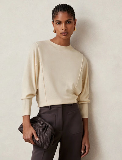 Denne striktrøje er fremstillet af en uldblanding med et strejf af cashmere, hvilket giver en fantastisk blødhed. Den har blødt draperede batwing-ærmer og taktile omvendte sømme, og er afsluttet med ribstrikkede kanter og en høj rund hals.