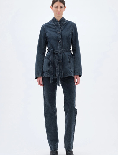 Denne denimjakke har en taljeret silhuet med et bælte i taljen og forlommer. Designet med knapper og en struktureret krave tilføjer et sofistikeret touch til denne alsidige beklædningsgenstand.