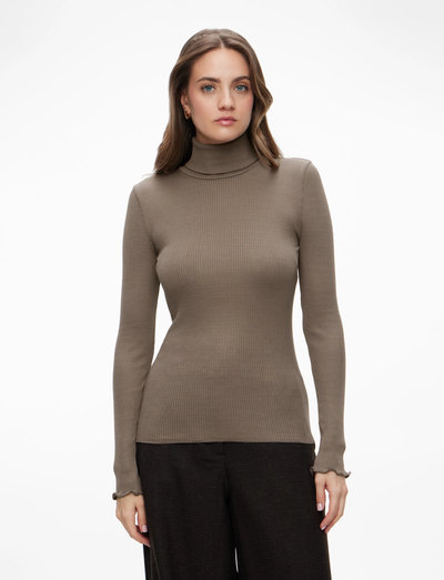 Denne rullekrave er fremstillet af blød silke og giver et behageligt og stilfuldt lag. Designet med lange ærmer har en delikat, subtilt rynket kant, der tilføjer et strejf af elegance til en klassisk silhuet.