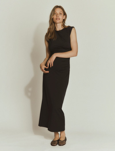 Elegant drapering definerer denne lange kjole og skaber en flatterende silhuet. Den kropsnære pasform fremhæver kurverne, mens det slanke design gør den perfekt til aftenarrangementer.