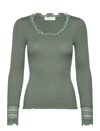 Delikat blondekant tilføjer et strejf af elegance til denne langærmede silke T-shirt. Det klassiske O-halsdesign gør den alsidig, så den kan bruges alene eller som et lag. Den er designet med en normal pasform, der giver både komfort og stil.