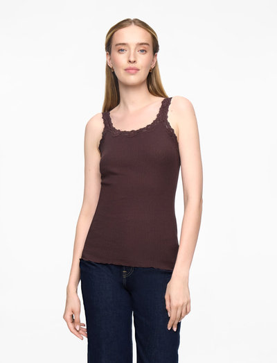 Delikate blondekanter tilføjer et strejf af elegance til denne ribstrikkede tanktop. Den dybe ryg og det ærmeløse design gør den perfekt til lagdeling eller til at bære alene.