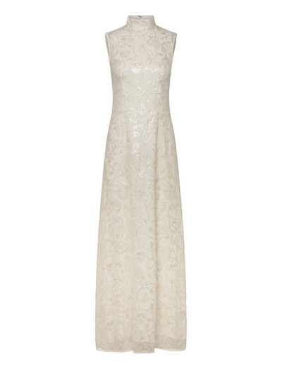Denne ærmeløse maxikjole er fremstillet med glitrende pailletter og giver en elegant silhuet. Den høje halsudskæring tilføjer et strejf af elegance, hvilket gør den perfekt til aftenarrangementer eller bryllupslejligheder.