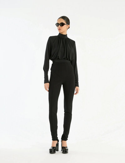 Denne top har en høj halsudskæring og lange ærmer, hvilket giver en sofistikeret silhuet. De rynkede detaljer tilføjer tekstur og visuel interesse, hvilket gør den til et bemærkelsesværdigt stykke tøj i enhver garderobe.