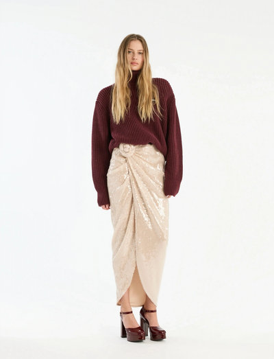 Glimtende pailletter fanger lyset på denne iøjnefaldende nederdel. En knudedetalje i taljen tilføjer et strejf af elegance, mens slidsen foran giver mulighed for bevægelsesfrihed.