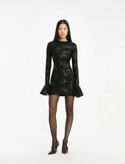 Blomsterformede pailletter tilføjer et strejf af glamour til denne minikjole. De lange ærmer og bodycon-pasformen skaber en flatterende silhuet, perfekt til en aften i byen.