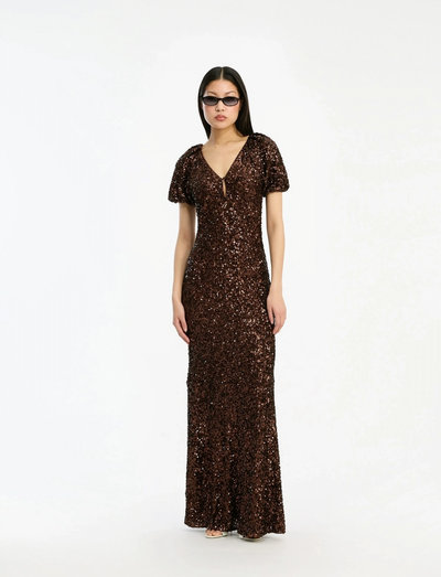 Glitrende pailletter fanger lyset på denne elegante midikjole, der er perfekt til aftenarrangementer. V-udskæringen og de korte ærmer tilføjer et strejf af klassisk elegance til den figursyede silhuet.