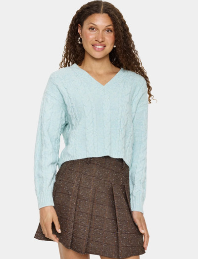 Denne pullover har et klassisk kabelstrikdesign og tilbyder både varme og tidløs stil. V-udskæringen tilføjer et strejf af elegance, hvilket gør den til et alsidigt stykke tøj, der kan bruges lagvis eller alene.