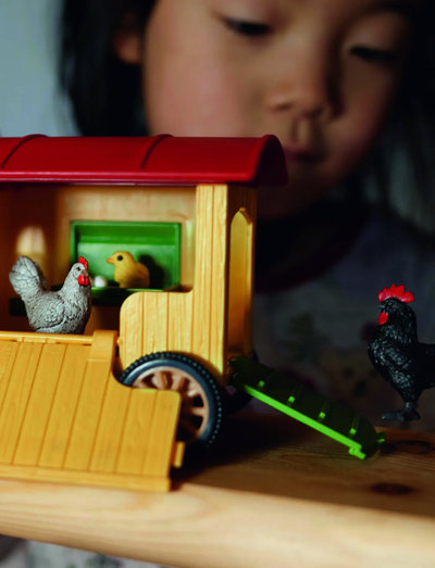 Kykkelikyyyy! Vores hane er stået op. Efter en god nattesøvn i hønsehuset fra schleich® FARM WORLD elsker hanen at hoppe op på taget for at fortælle alle, at det er på tide at stå op. Så hønemor behøver ikke engang et vækkeur længere og kan gå ud for at finde korn og andet foder i det indhegnede udendørs område. Man siger jo, at morgenstund har guld i mund! Når hanen kommer ned fra taget for at finde foder sammen med hønen, kan du åbne taget og kigge ind i huset. Og se nu bare: Et par af æggene er allerede klækket, og verdens sødeste kyllinger begynder at se sig omkring og tage de første skridt. Kan du hjælpe dem?