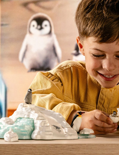 Disse pingvinunger er ret vilde! den ældre pingvin kan bare ikke få nok af is-rutsjebanen. igen og igen suser den ned ad den glatte is-sliske. og plask – så lander den i vandet. den svømmer hurtigt tilbage til isflagen med rutsjebanen. vent, hvad er det for en knasende lyd? åh, den lille pingvinkylling er ved at klække ud af sit æg! den vil også gerne have det sjovt i pingvinfamilien med det samme. se, hvor sød den er, når den vralter akavet op ad skråningen for at komme hen til is-vippen.