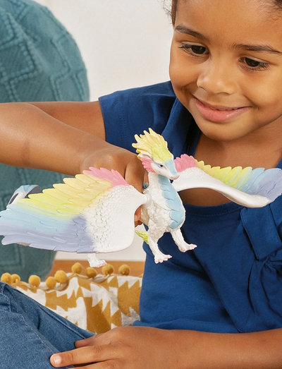 Så er den her! I BAYALA®-verdenen siger man, at det er endnu mere sjældent at få øje på den end at se stjerneskud om natten eller finde et kløverblad med præcis fire blade. Men når vores regnbuedrage fra schleich® BAYALA®-verdenen dukker op i loftet på dit børneværelse, er den enten på vej til dig, eller også er forsyningerne i dens hule sluppet op igen. Eller begge dele. Dens farverige fjerdragt reflekterer alle solens stråler med hvert eneste vingeslag. Du kan som regel også høre den - enten på grund af dens høje kald, eller fordi dens hale har fejet noget ned fra hylden igen. Tror du, at den vil rydde op efter sig?